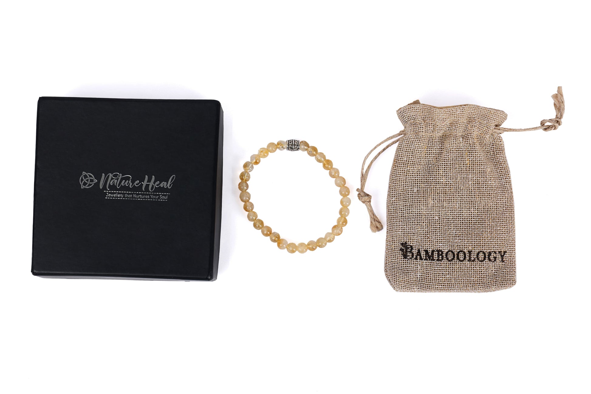 Original, certified Citrine bracelet with 24 beads. Attractive glossy beads, neatly woven, with strong elasticated thread for good grip. These calming Pale beads bracelet has luxurious look which easily goes with your attire. This bracelet comes in an attractive Velvet string pouch which makes easy to keep it safe.